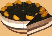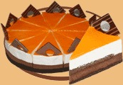 Тонкий шоколадный бисквит, дополненный сочетанием апельсинового и шоколадного муссов. Украшается шоколадным гляссажем и мандаринами.