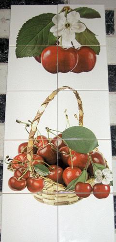 "Мини фотопанно для кухни "Вишня в корзине". Размер 0,3м х 0,75м. Плитка 15см х 15см. Исполнение глянцевое."
