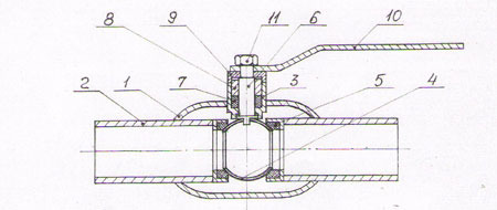 "Устройство: Шаровые краны имеют неразъемную цельносварную конструкцию и состоят из корпуса (1), патрубков (2), горловины (3), шаровой пробки (4), обж...