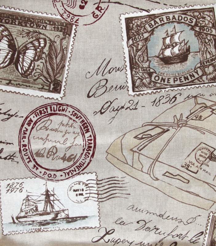 Ткань с изображением коллекционных марок позапрошлого века на фоне рукописных заметок. Производство - Casablanca, Испания