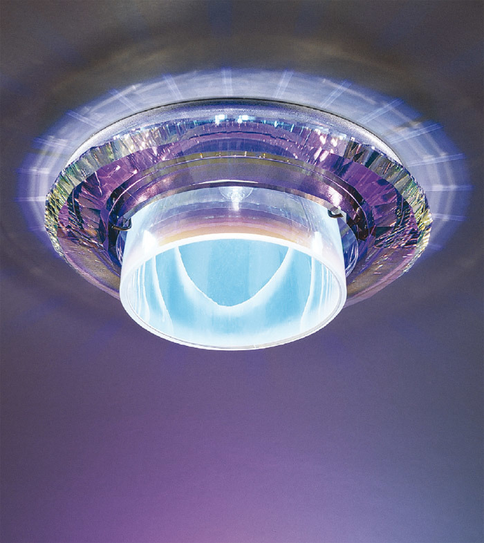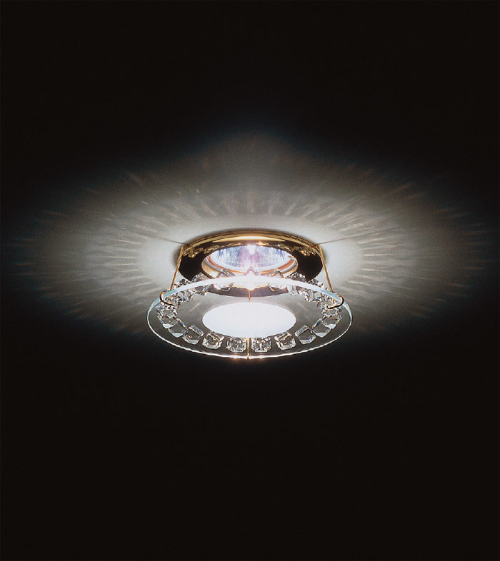 Урезанный светильник с ограненным хрустальным кольцом создает сонаправленные отражения света на потолке. Металлическая часть светильника покрыта хруст...