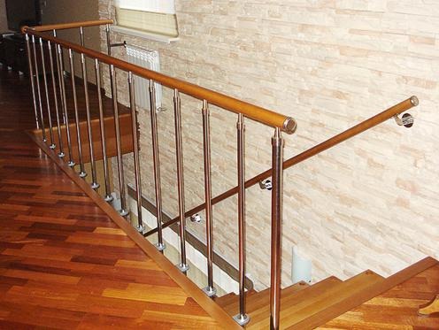 Стойки ограждения выполнены из полированной нержавеющей трубы. Поручень круглый деревянный (возможен металлический). Пристенный деревянный поручень.