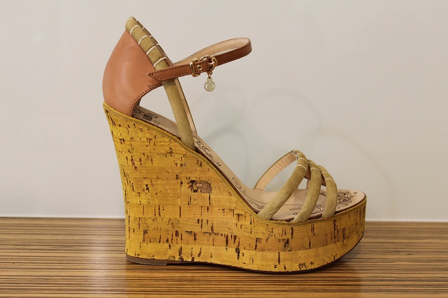 Великолепные босоножки, верх которых выполнен из натурального материала. Модель на высокой изящной танкетке снабжена застежкой на пряжку. Отличный вар...