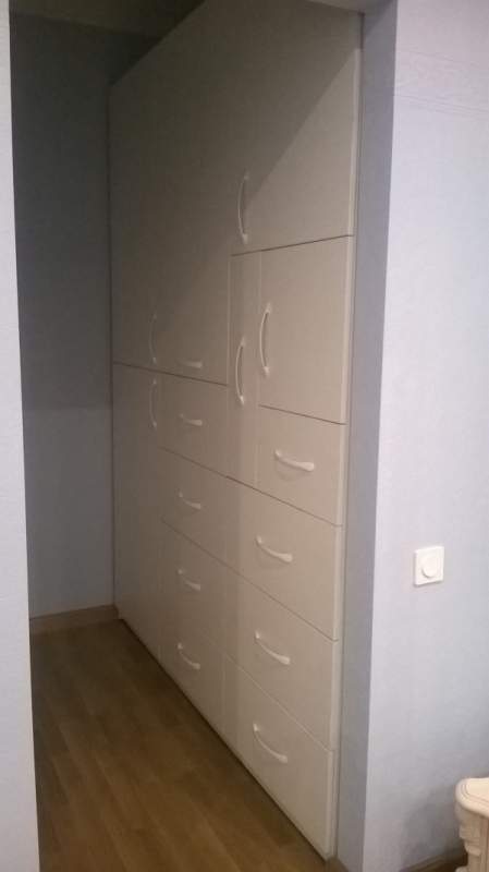 Гардеробная в г.Москва. Слева глубокий шкаф с вложенными сдвижными шкафами, справа глубокий шкаф с ящиками и полками, а также отделениями для бижутери...