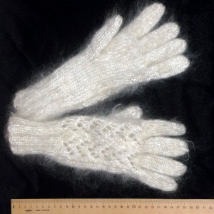 Белые женские перчатки, на верхней стороне ажурная сетка. Изготовлены из 100% козьего пуха. Теплые, красивые. Пушоные.