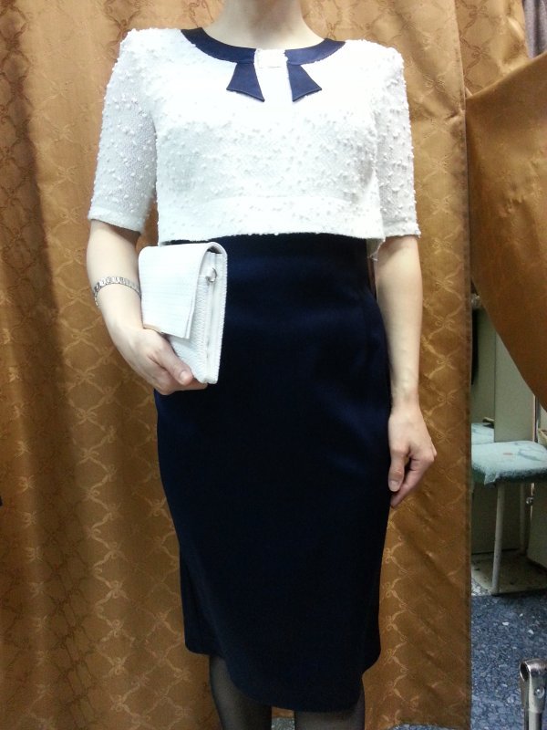 Платье нарядное из темно-синего атласа и белого болеро "букле". Очень эффектно оформлена спина - под разрезом болеро, проглядывается гипюр. Отличный в...