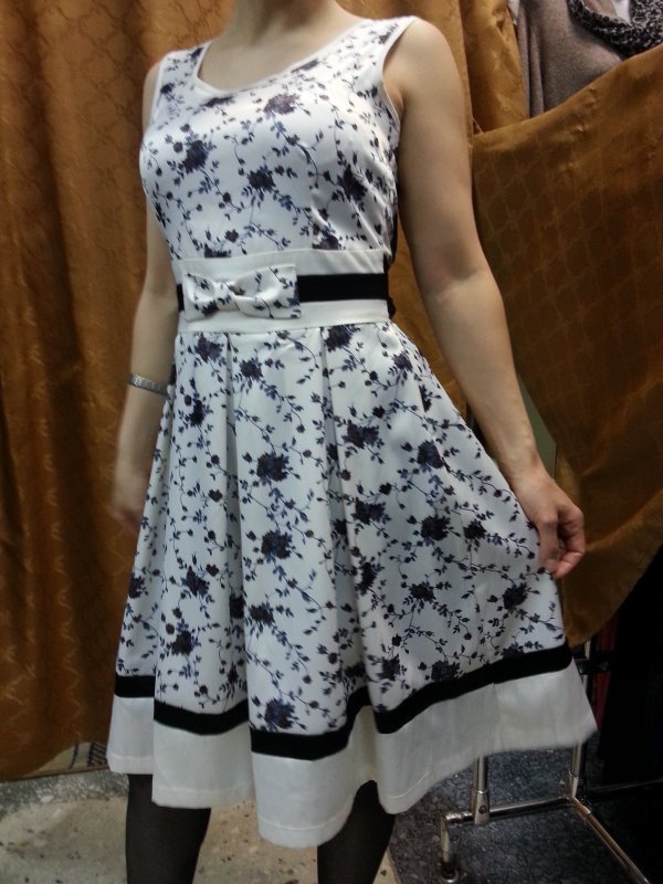 Легкое летнее платье из атласа. С красивым вырезом на спине и втачным атласным поясом в виде банта сзади.