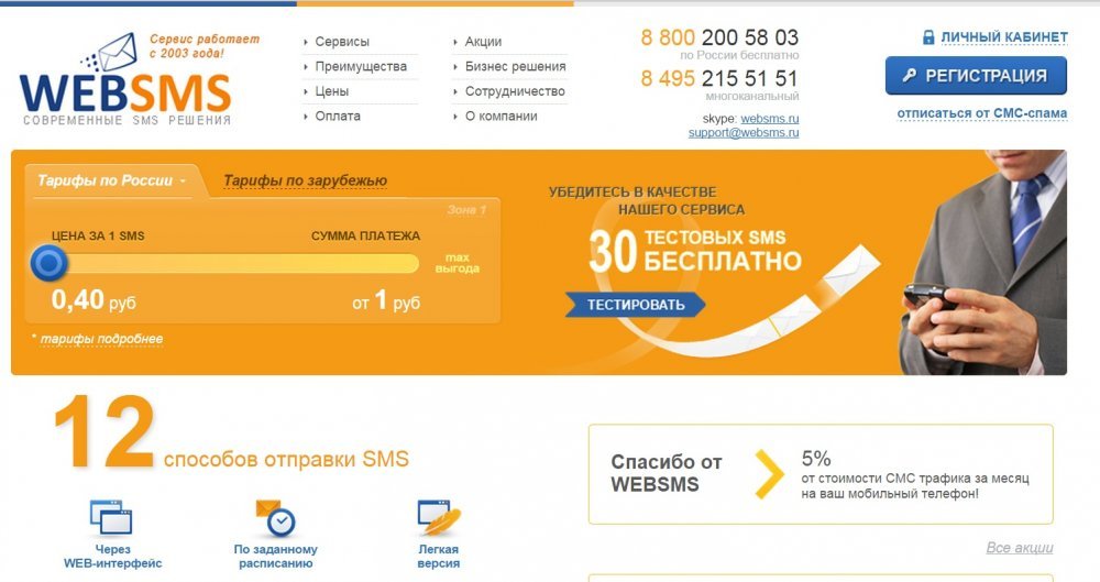 ВЕБСМС предоставляет полный пакет услуг, связанных с смс-сервисами. Мы имеем опыт работы в сфере телекоммуникаций и смс-технологий с 2003 года. Уникальное программное обеспечение, разработанное нашими специалистами, мощное оборудование, высокоскоростные независимые выделенные каналы связи, прямое включение в канал передачи данных Е1, выгодные условия сотрудничества с операторами сотовой связи позволяют нам предоставлять своим клиентам современные, эффективные и недорогие услуги в сфере смс-информирования. Наши смс-решения способствуют развитию любого бизнеса и обеспечивают быструю и прямую связь с клиентами и потребителями услуг наших заказчиков. Мы легко адаптируем возможности нашей системы под индивидуальные потребности своих клиентов, обеспечивая удобство и простоту в работе, включая осуществление смс-рассылок, получение обратной связи и информации о доставке каждому получателю информации от наших клиентов. Услугами ВЕБСМС пользуются государственные и общественные организации, торговые компании, производители услуг и товаров народного потребления, учебные заведения, медицинские учреждения и физические лица по всей территории России, стран СНГ и дальнего зарубежья. Наши решения – залог процветания Вашего бизнеса! Протестируйте возможности нашей системы и получите конкурентное преимущество!
