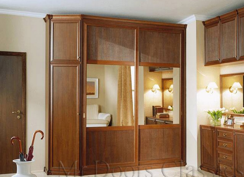 Изящное решение для прихожей: шкаф с комбинированными дверьми-купе и угловой секцией встроен в угол, антресоли и комод уда...