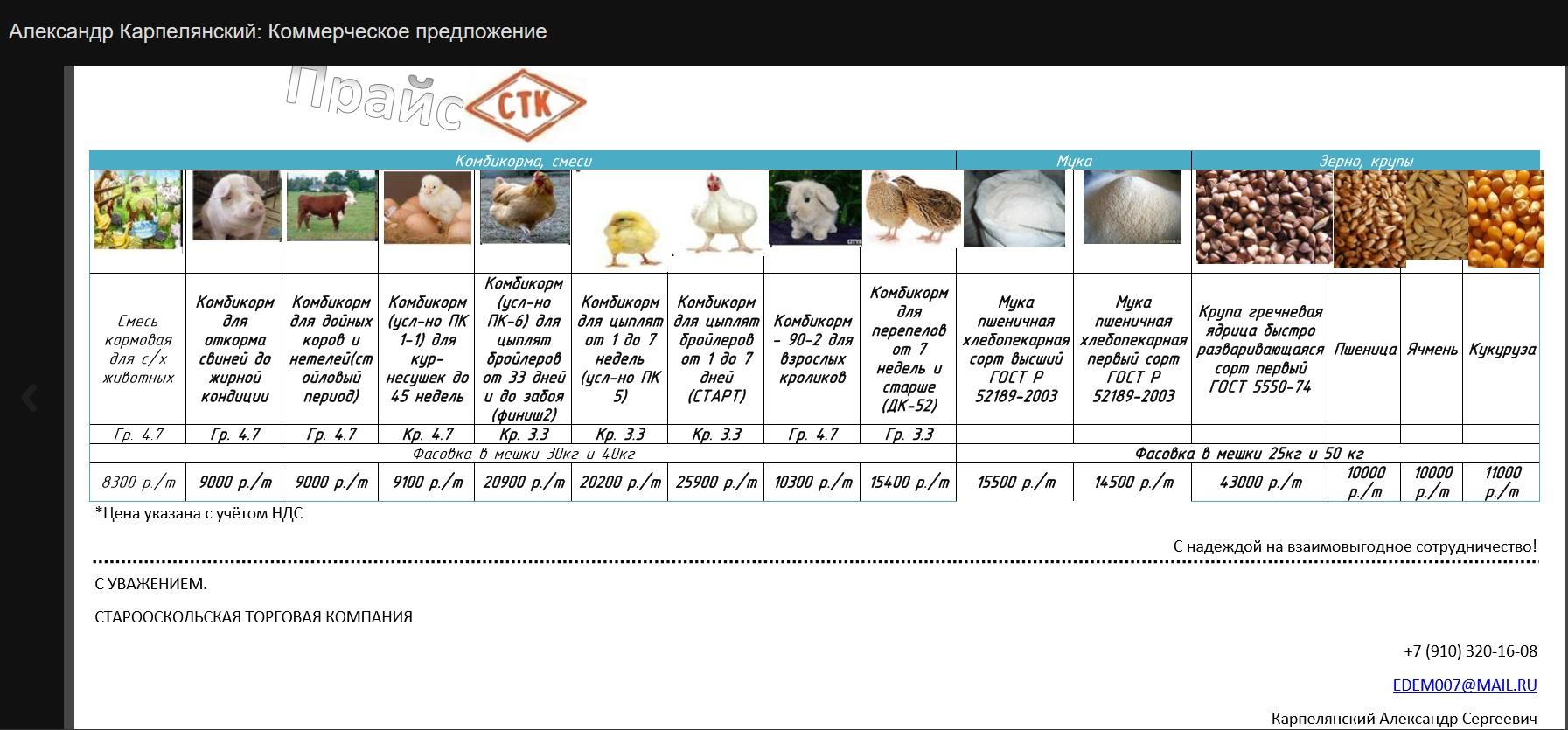 Комбикорма представляют собой сложную однородную смесь различных кормовых средств, предварительно очищенных, измельченных и подобранных по особым рецептам. Комбикорма обеспечивают животных всеми необходимыми веществами и микроэлементами для эффективного роста и развития. Так же присутствует мука высший и первый сортов. Зерно: пшеница, ячмень, кукуруза, греча.