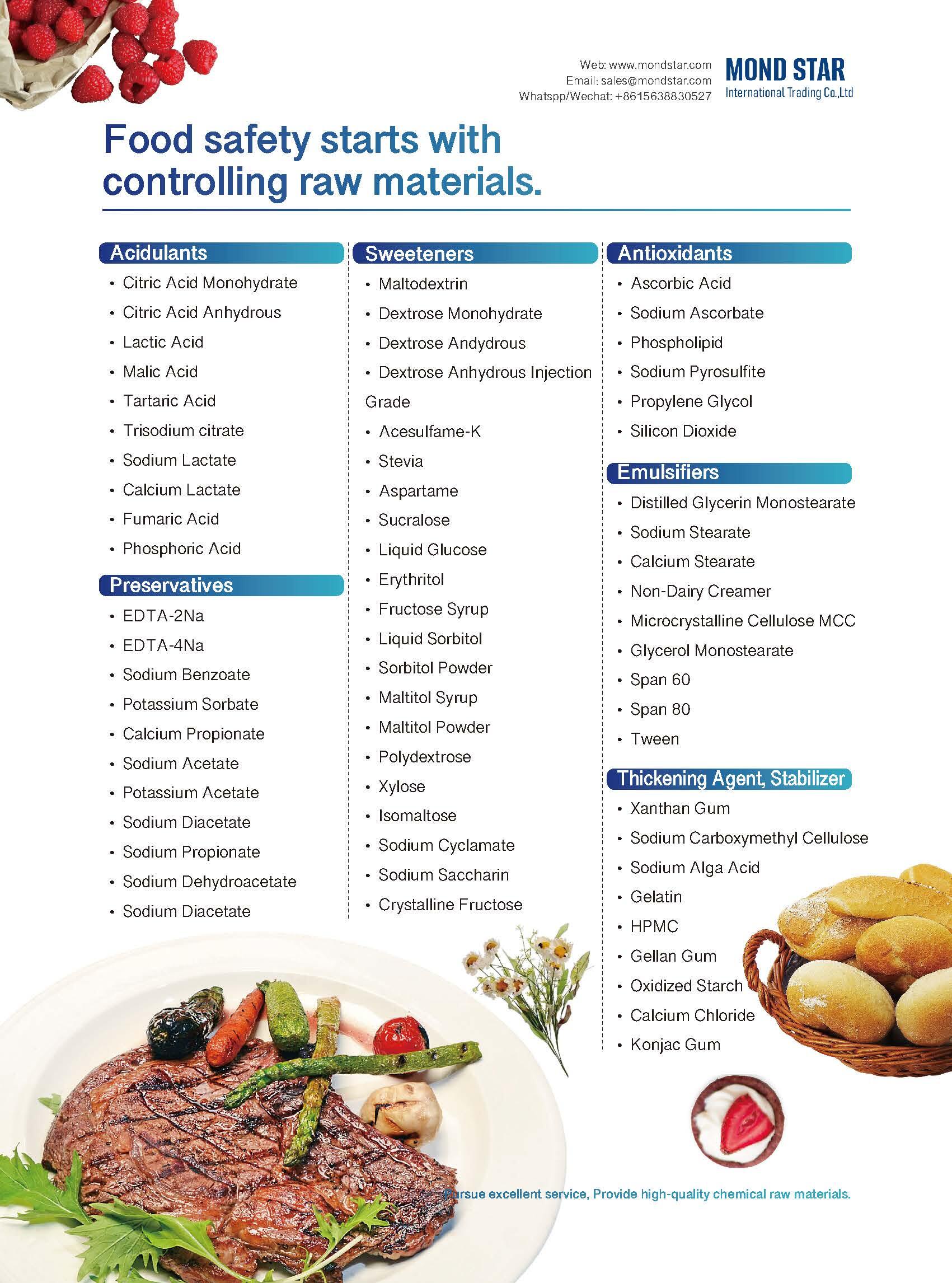 Mond Star established in 2016,but started food additives business in 2012, our first customer was from Middle East with 10 FCLs ammonium bicarbonate, currently Mond Star has many partners from Pakistan,Dubai,Bangladesh,Peru,etc. Our strong products includes citric acid,lactic acid ,dextrose monohydrate,xanthan gum,ammonium chloride etc.