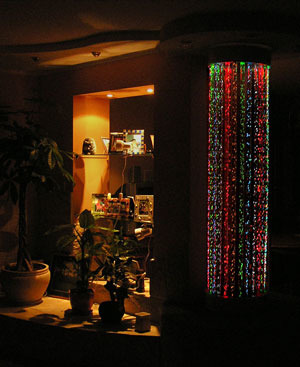 Пузырьковые колонны комплектуются подсветкой (есть возможность управления с дистанционного пульта). Она может быть однотонной или динамично изменяющейся в разные цвета. В отличие от аквариума, требует