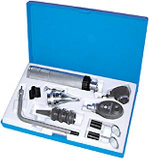 Диагностический набор для прямой офтальмоскопии с асферической прецизионной оптикой. В комплект входит: — Рукоять EUROLIGHT, 2,5V с реостатом плавной регулировки освещения, питание от батареек тип С (1,5V 2шт.) с винтовым креплением для головки. — Головка лампочного отоскопа COMBILIGHT C10 с поворотной 3-х кратной лупой и возможностью проведения пневмотеста. — Головка офтальмоскопа EUROLIGHT Е10 , с корригирующими линзами +/- 20 диоптрий. Диафрагма - большой круг. — Два ларингеальных зеркала (20мм и 22мм) — Изогнутый кронштейн осветителя — Три многоразовые ушные воронки (размеры 2,5/ 3,5/ ,4,5 мм.) — Носовое зеркало — Держатель шпателя — Запасная лампочка (REF 28943) для отоскопа или кронштейна осветителя. — Футляр - пластиковый кейс. Элементы питания в комплект не входят.