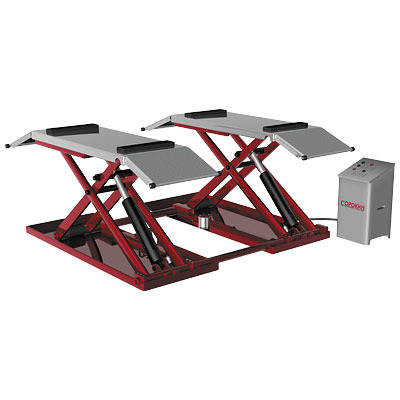 одъемник ножничный, электрогидравлический, напольный, г/п 3000 кг., 2,6 кВт, высота подъема 1820 мм., размеры платформ 1435х600 мм., клиренс 115 мм., 4 независимых гидравлических цилиндра. Два двой