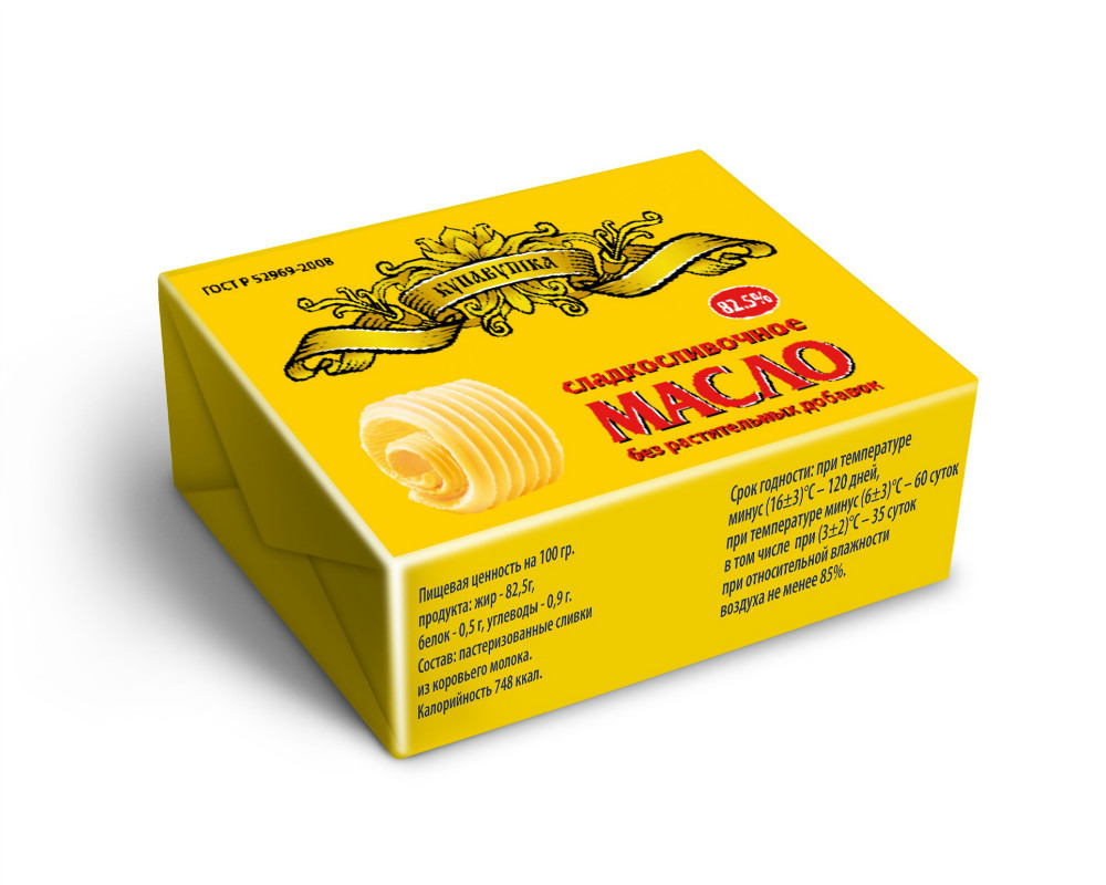 "Вес: 180г, 200г, Жирность: 82,5%. Упаковка: кашированная фольга; Пищевая ценность на 100г. продукта: жир - 82,5 г, белок - 0,5г, углеводы - 0,9г. Состав: пастеризованные сливки из коровьего молока. Калорийность: 748 ккал. Срок годности: при температуре минус (16±3)°С - 120 дней, при температуре минус (6±3)°С - 60 суток, в том числе при (3±2)°С - 35 суток, при относительной влажности воздуха не менее 85%. Количество в коробке 180г - 30 шт., 200г - 20 шт."