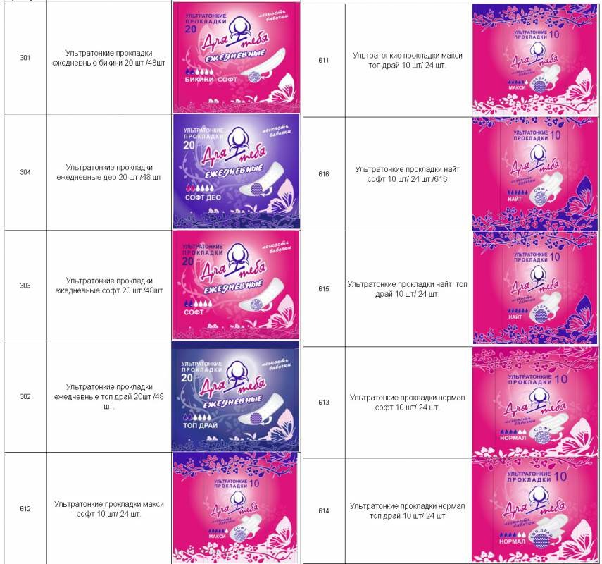 "Ультратонкие гигиенические прокладки «Для тебя». Изготовлены с применением мягкого, как хлопок, экологически безопасного верхнего покрытия; тонкий поглощающий материал с добавлением геля обеспечивает