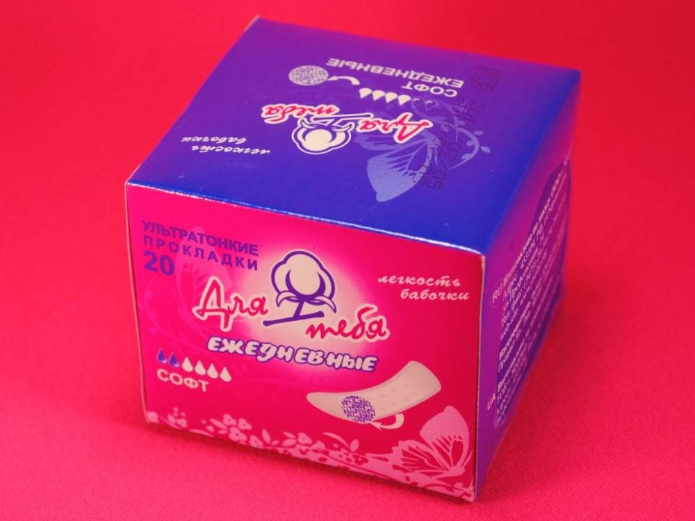"Ультратонкие гигиенические прокладки «Для тебя». Изготовлены с применением мягкого, как хлопок, экологически безопасного верхнего покрытия; тонкий поглощающий материал с добавлением геля обеспечивает повышенную впитываемость и сохраняет форму прокладки при использовании."