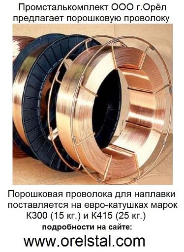 Промсталькомплект ООО (г.Орёл,ул.Московская,69) поставляет проволоку порошковую для наплавки (ПП-АН) ПП-АН 180МН ТУ 127400-002-70182818-05 2.0 ПП-АН 105 ПП-НП 90Г13Н4 2.8 ПП-АН 106 ПП-НП 10Х14Т 2.8 ПП-АН 120 ПП-НП 18Х1Г1М 3.2 ПП-АН 122 ПП-НП 30Х5Г2СМ 2.6 ПП-АН 125 ПП-НП 200Х15С1ГРТ 2.6; 3.2 ПП-АН 130 ПП-НП 25Х5ФМСТ 2.6 ПП-АН 134 ПП-НП 15Х13Н2Г2Т 2.0; 2.6 ПП-АН 138 ПП-НП 10Х15Н2Т 2.6 ПП-АН 147 ПП-НП 30Х2М2ФН 2.6; 3.2 ПП-АН 170 ПП-НП 80Х20Р3Т 3.2 ПП-ТН 250 ПП-НП 14ГСТ 2.6; 3.0 ПП-ТН 350 ПП-НП 19ГСТ 2.6; 3.2 ПП-ТН 500 ПП-НП 50Х3СТ 2.6; 3.2 ПП-НП 100Х4Г2Р 2.6; 3.0 ПП-НП 50Х5ГСМ 1.8 ПП-НП 70Х4М3Г4ФТР 2.6; 2.8 ПП-НП 25Х9Г9Р 2.6; 2.8 ПП-НП 07Х12Н3М2Г2Т 2.0 ПП-НП 10Х17Н9С5ГТ 2.6 ПП-НП 08Х19Н9С5ГРТ 2.6 ПП-НП 90Х4М5ВФ 2.2 ПП-НП 35В9Х3СФ 3.2; 3.6 ПП-АНВ2У 2.6; 3.0 ЗВОНИТЕ! тел.8-910-7481603 тел.8-910-2604585 (4862) 48-16-03 www.orelstal.com