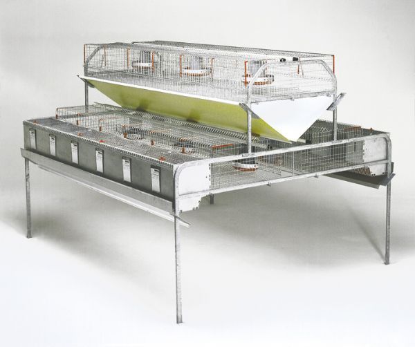 Клетка для кроликов ДВУХЯРУСНАЯ НА 24 МЕСТА (ИТАЛИЯ) АРТ. Z66/FRA R/E Клетка для содержания самок, нижний ярус 12 мест и ремонтного молодняка 12 мест с верху. Клетка изготовлена из сетки оцинкованной после сварки. Передняя часть клетки сделана из материала с применением анитикислотного алюмоцинкового покрытия. Общая для клетки 2270 мм. Размер 1 места (клетки) для самок длина с гнездом 600 мм, без гнезда (перегородки) 860 мм, ширина 380 мм. высота 310 мм. Верхний ярус клетки для ремонтного племени : длина 410 мм, ширина 380 мм. и высота 310 мм.