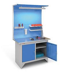 Верстак слесарный ВЛК-2-13 Верстак сборно-разборный, модульный. Верстак ВЛК-2-13 состоит из двух тумб, экранов с необходимой оснасткой и светодиодного освещения. Двери тумб закрываются на ключевой замок. Каждая тумба укомплектована одной полкой, причем в одной тумбе полка является стационарной, а в другой - регулируется по высоте с шагом 50 мм. Освещение укомплектовано энергосберегающим светодиодным светильником с большим сроком службы, который обеспечивает освещенность 1000Lx рабочей поверхности верстака. Светильник имеет кабель длиной 3 метра с выключателем. Угол наклона светильника регулируется. Столешница верстака изготовлена из фанеры толщиной 21 мм. Фанера покрыта оцинкованным листовым металлом. Верстак окрашен порошковой краской. Двери тумб — цвет синий (RAL 5012), остальные элементы — цвет серый (RAL 7038). Изделие сертифицировано. Гарантийный срок — 12 месяцев. Важно! Экран уже укомплектован Полками навесными (2 шт.), Держателями инструмента для отверток (1 шт.) и ключей (1 шт.). При необходимости на Экран можно установить дополнительные Полки навесные, Держатели для инструмента, а так же Крючки и Ящики пластиковые (покупаются в аксессуарах).