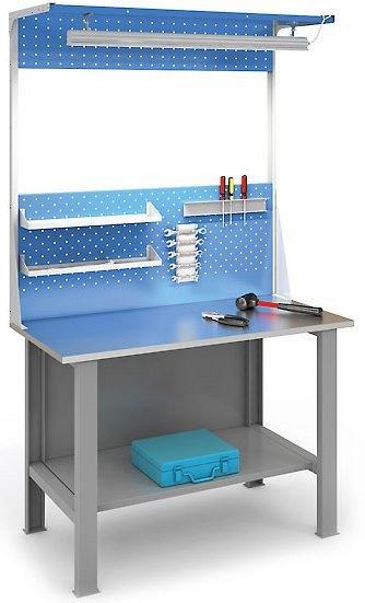Верстак ВЛ-2-12 Столешн. 1200*600 мм Высота 2060 мм Вес - 65,3 кг На столешницу 200 кг Светодиодное освещение Верстак сборно-разборный, металлический. Верстак ВЛ-2-12 состоит из 2-ух опор, столешницы из фанеры толщиной 21 мм, 2-ух полок, экрана с необходимой оснасткой и светодиодного освещения. Освещение укомплектовано энергосберегающим светодиодным светильником с большим сроком службы, который обеспечивает освещенность 1000Lx рабочей поверхности верстака. Светильник имеет кабель длиной 3 метра с выключателем. Угол наклона светильника регулируется. Столешница верстака изготовлена из фанеры толщиной 21 мм. Фанера покрыта оцинкованным листовым металлом. Экраны укомплектованы полками навесными (2 шт.), держателями инструмента для отверток (1 шт.) и ключей (1 шт.). На экран можно установить дополнительные полки навесные, держатели для инструмента, а так же крючки. Верстак окрашен износоустойчивой порошковой краской. Двери тумб — цвет синий (RAL 5012), остальные элементы — цвет серый (RAL 7038). Изделие сертифицировано. Гарантийный срок на изделие — 12 месяцев.