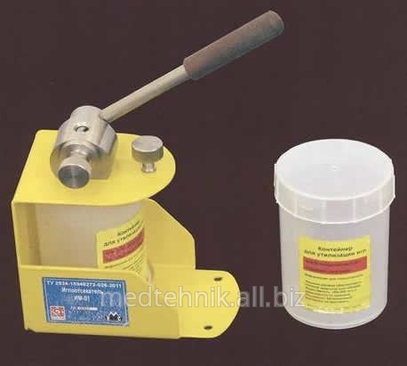 Одноразовое устройство для утилизации игл после применения. Предназначен для обрезания иглы на уровне ее втулки и утилизации игл в контейнере из твердой пластмассы. Может вмещать в себе 400-600 игл, в