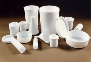 Посуда лабораторная из фторопласта-4 предназначена для различных лабораторных работ с агрессивными средами при температуре до плюс 200°С. Её можно применять вместо платиновой и стеклянной посуды. В лабораторной посуде из фторопласта-4 допускается нагревать, кипятить, выпаривать растворы, вскрывать руды и растворять осадки с помощью водяных и других бань, а также с применением электроплиток с закрытыми нагревателями, исключающими нагрев посуды выше плюс 200°С. На открытые нагреватели и открытый огонь лабораторную посуду из фторопласта-4 ставить запрещается. По показателям качества посуда должна соответствовать требованиям и нормам, указанным в таблице. Гарантийный срок хранения — 20 лет со дня изготовления. Показатели качества посуды лабораторной фторопластовой Первый сорт Второй сорт Цвет и внешний вид поверхности Поверхность изделий должна быть белого цвета без трещин, раковин и расслоений Поверхность изделий должна быть от белого до серого цвета без трещин, раковин и расслоений Допускается: перламутровый блеск поверхности, включения размером до 1мм без ограничения перламутровый блеск поверхности, сколы, раковины и вмятины глубиной не более 20% от номиналыного размера толщины стенки, указанной в чертежах изделия, включения размером до 3мм без ограничения, следы от режущего инструмента и от разъемов технологической оснастки Не допускаются: отдельные включения более темного цвета, чем основной цвет изделий, площадью свыше 6мм2 отдельные включения более темного цвета, чем основной цвет изделий площадью свыше 8мм2 включений размером от 1 до бмм2 не должно быть более 2шт. на каждые 25см2 площади изделий включений размером от 3 до 8мм2 не должнобыть более 2шт. на каждые 25см2 площади изделий