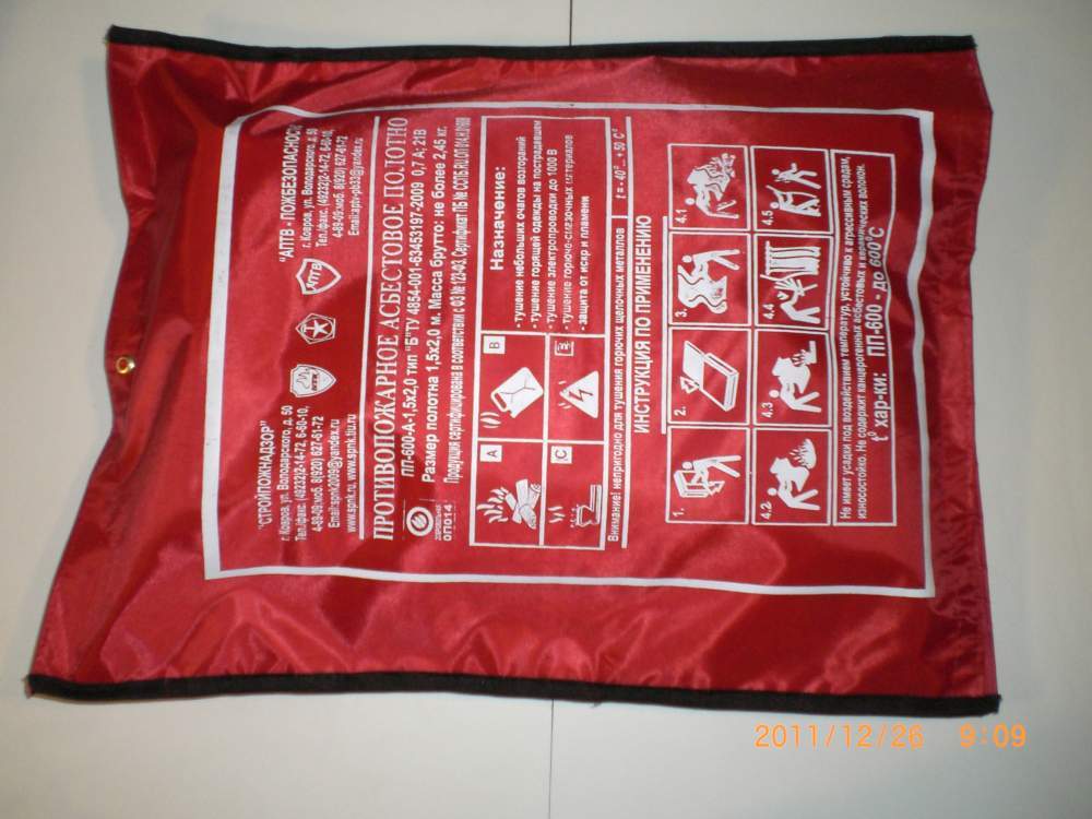 Полотно противопожарное от производителя ПП-600-1.5х2.0ТУ 4854-001-63453197-2009(ТУ 4854-001-93543472-2007 с дополнениями и изменениями). Продукция сертифицирована в соответствии с Федеральным Законом