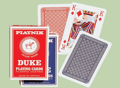 Игральные карты Дюк 55 листов Артикул: 1357 Игральные карты с пластиковым покрытием 55 листов Стандартный индекс Классические лица Размер: 58 х 89 мм (бридж) Производство: Австрия Синий и красный цвет Упаковано по 12 штук в блоке
