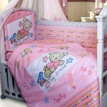 Комплектация: 7 предметов (бампер, балдахин, одеяло, подушка, пододеяльник, наволочка, простыня на резинке) 120х60см