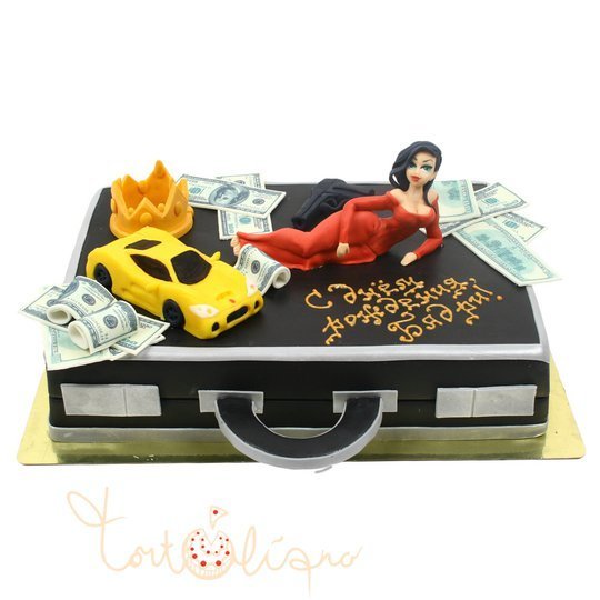 Вес торта на фото 3 кг Цена указана за 1 кг. От разнообразия декора этого торта просто идет кругом голова. Он выполнен в виде чемодана, на котором красуется соблазнительная девушка в окружении денег, короны и роскошной машины.