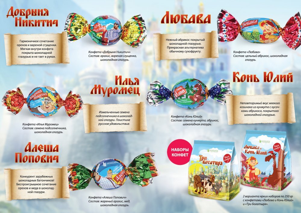 ГК "РегионРитейлГрупп в декабре 2014 года совместно с кинокомпанией "СТВ", студия анимационного кино "МЕЛЬНИЦА" к 70-лет Дня Победы запустила новый проект "ТРИ БОГАТЫРЯ" шоколадные конфеты в глазури. Наша компания является эксклюзивным производителем конфет "Три богатыря" на территории России и СНГ. - Илья Муромец. - Добрыня Никитич. - Алёша Попович. - Любава. - Конь Юлий.