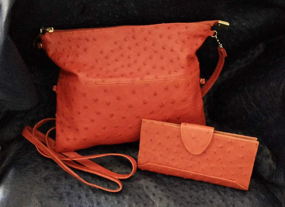 Сумка-клатч из страусиной кожи. Имеет одно большое отделение и три внутренних кармана. Имеется длинный ремешок через плечо и ручка-петля для носки сумки на руке.