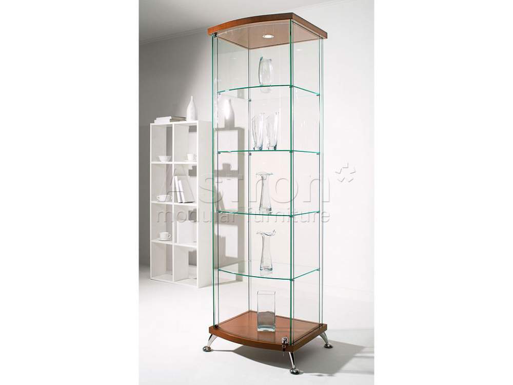 Витрина угловая с гнутым фасадом As64.07-01 В комплект поставки входит: три полки стеклянныедва комплекта мебельных светильников (галогенновых)комплект ножекзамок. Общие характеристики: стекла го
