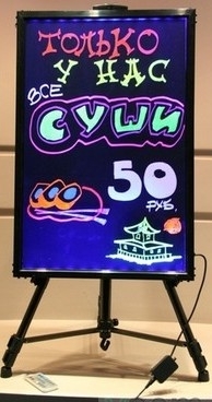Броская,привлекающая взгляд и самое главное,неповторимая световая реклама с помощью LED-доски 100% привлечет внимание клиентов!!! Сравнить цены на acctech.ru 4900р. Использовать светящуюся LED- доску Ledmenu можно практически везде: в ресторане кафе барах ночных клубах развлекательном центре в точках продаж в виде информации и проведения акций (гипермаркеты,рынки,торговые павильоны) в туристических агентствах в окнах магазинов в праздничных мероприятих в виде конкурсов(свадьбы,банкеты,корпоративы) в витринах магазинов и многих других места, где есть необходимость в хорошей информативной и необычной заметной рекламе.