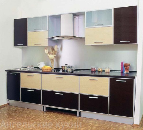 Кухни из пластика на заказ арт. КП015 Прекрасная контрастирующая кухня из пластика в сочетании светлых и тёмных оттенков прекрасно подойдёт для просторного помещения. Кухня превосходно сочетает в себе компактность, комфортность, кроме того, выбранный дизайн кухни, имеется в виду цветовая гамма, которая представлена не классическим глянцем, а матовой поверхностью, включая то, что ручки шкафчиков также матовые, визуально увеличивает объёмы помещения, в результате чего создаётся впечатление простора, кроме того, она является достаточно функциональной, поскольку представлена большим количеством вместительных шкафчиков и колок, что позволяет домохозяйкам хранить в них любые предметы кухонной утвари, кухонное оборудование и так далее. Как вы уже могли заметить, кухня, помимо пластиковых шкафчиков представлена также и двумя стеклянными подвесными шкафчиками, что делаёт её ещё более привлекательной. Купить кухню в Москве можно предварительно подав заявку.