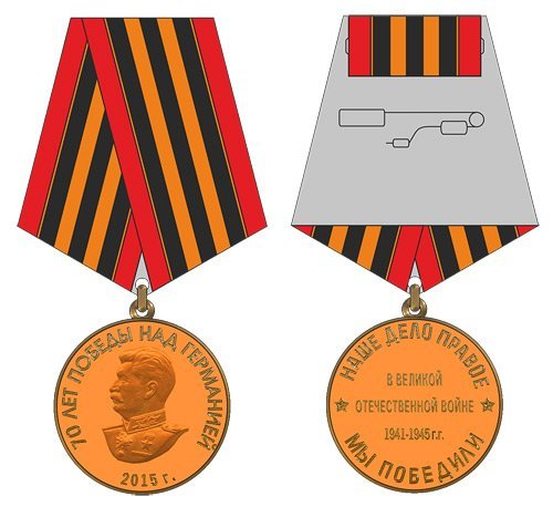 Юбилей Победы в 2015 году изданием различной патриотической памятной продукции отметят и общественные организации. Региональная общественная организация «Академия русской символики «МАРС» предлагает Вашему вниманию медаль, которая по своей семантике практически является репликой медали, выпущенной ко Дню Победы 70 лет тому назад. Удачное символическое решение нами использовано не случайно, и сделано это, прежде всего, для того, что бы еще раз показать некоторым либеральным «историкам» и «политикам», что общество стоит на защите исторической справедливости и старается яростно воспрепятствовать силам, которые готовы переписать историю, девальвировать значение советского народа в спасении мира от фашистской чумы, замылить значение лидеров СССР и героических военачальников в деле Великой Победы, и прежде всего Иосифа Виссарионовича Сталина!
