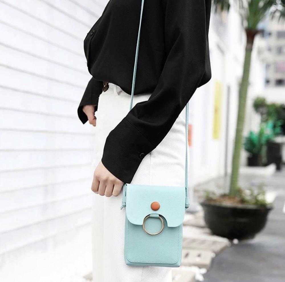 Компактная стильная сумочка для телефона, необходимый аксессуар для лета. Размер: 13х2х18 см, длина ручки 120 см. Цвета: голубой, красный, розовый, серый, чёрный