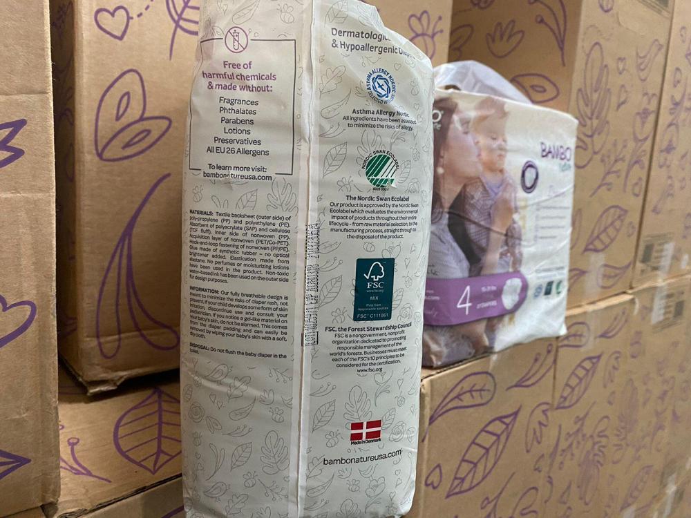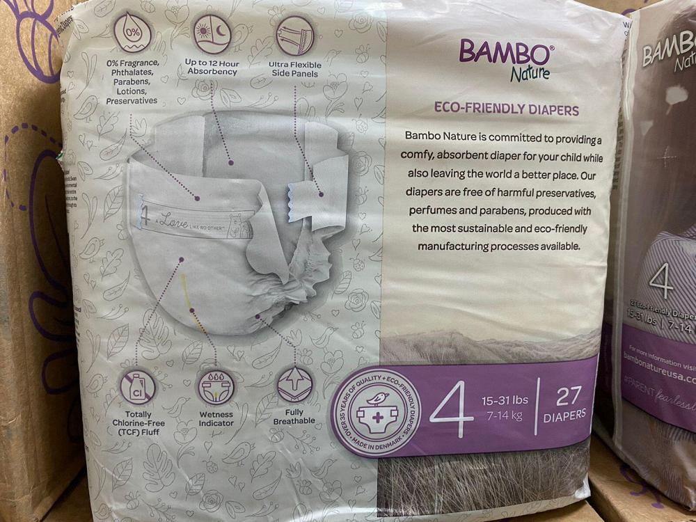 Bambo Nature Dream (Размер 4, 7-14 кг): Количество слоев: 3-слойная конструкция, включающая нетканый внешний и внутренний слой, а также впитывающее ядро. Материалы: Используются мягкие и дышащие нетканые материалы, целлюлозное волокно (небеленая, без хлора), суперабсорбент (SAP), эластичные манжеты, индикатор влажности. Впитываемость: Высокая, обеспечивающая до 12 часов сухости, благодаря SAP-полимеру, который моментально преобразует жидкость в гель, и целлюлозе. Особенности: Безопасность: Не содержат хлора, отдушек, лосьонов, тяжелых металлов, фталатов, парабенов. Экологичность: Сертифицированы Nordic Swan Ecolabel и Asthma Allergy Nordic. Дизайн: Трусики-подгузники, легко надеваются и снимаются, имеют индикатор влажности. Производство: Дания. Ключевые материалы: Мягкий внешний слой: Нетканый материал (полипропилен/полиэстер). Внутренний слой (Top Sheet): Нетканый материал, обеспечивающий сухость кожи. Впитывающее ядро: Смесь целлюлозы (из устойчивых источников) и SAP-полимера.