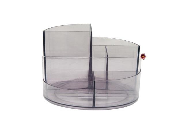 Подставка для канцелярских принадлежностей Профи прозрачная Артикул: ГАRUCTOP05 Описание: Подставка для канцелярских принадлежностей. Прозрачная. Не вращается. Круглая. Имется одно высокое отделение для ручек, линеек, карандашей, отделение для бумаги для заметок, отделение для степлера, отделение для маркеров, и два плоских отделения для мелкой канцелярии (скрепки, ластик, точилка, скобы и т.д.)