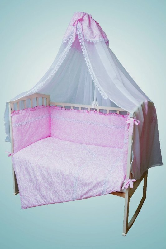 Комплектация 7,6,4,3 предмета.Сатин, кружево, сетка, холлкон.- Борт стёганый 40*360 из четырёх частей- Балдахин из нежной сетки 400