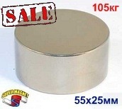 Модель: Д-55х25 Форма: Диск Диаметр:55 мм Высота: 25 мм. Вес: 350 г Покрытие: Поверхн. никелированная (Ni-Cu-Ni) Намагничивание: N42 Сцепление: прибл....