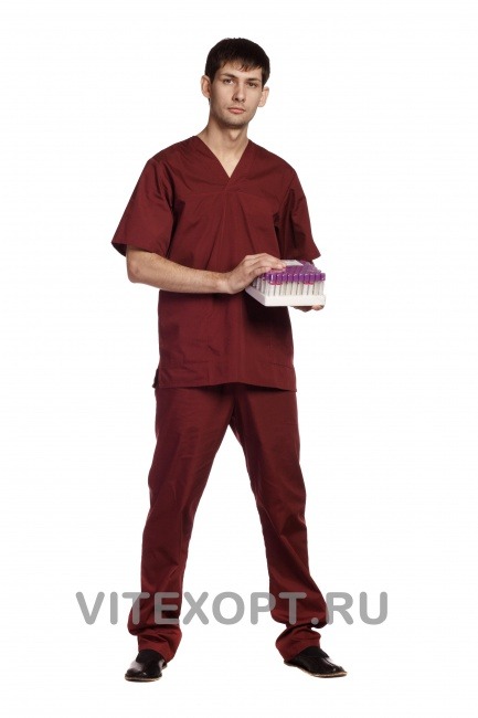 "Одежда хирурга Костюм состоит из блузы и брюк, блуза с V-образным вырезом горловины; три накладных кармана; рукав короткий; горловина и рукава с обта...